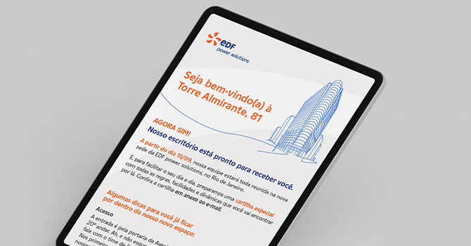 Nesse contexto, a Aldeia foi convidada a estruturar a comunicação do Day One no novo escritório do Rio de Janeiro e a desdobrar essa mensagem para os demais escritórios do país. O desafio era traduzir a nova identidade da EDF Power Solutions, apoiando a integração das equipes e reforçando a cultura organizacional e a visão de futuro compartilhada.