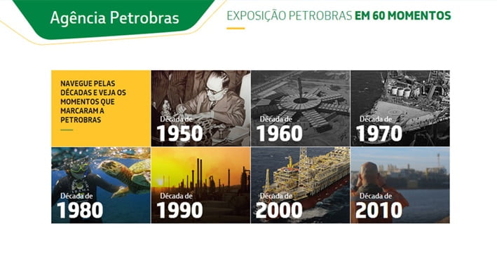 No aniversário de 60 anos da Petrobras, trabalhamos na criação do hotsite “Exposição Petrobras em 60 momentos”, para a assessoria de imprensa da empresa. O projeto foi voltado para os jornalistas de veículos brasileiros e estrangeiros, que poderiam fazer o download de fotos em alta, material de áudio e de vídeo, navegar pelas décadas e momentos mais importantes da empresa, desde a sua fundação.